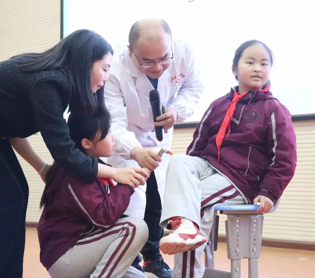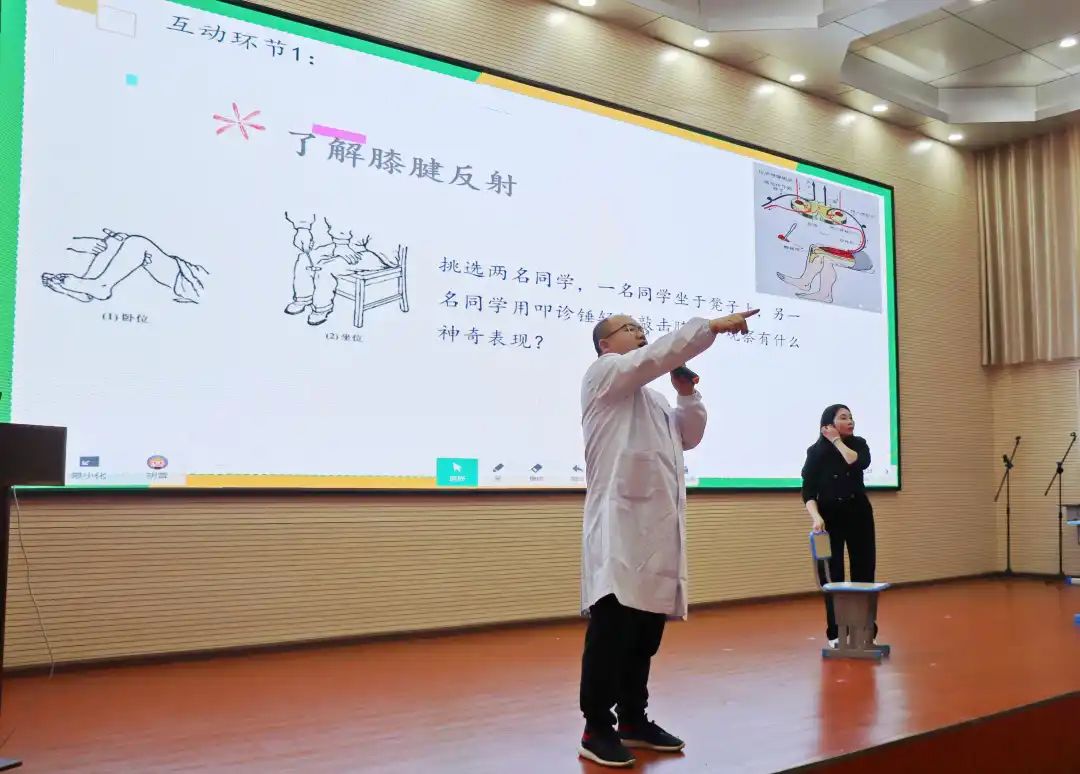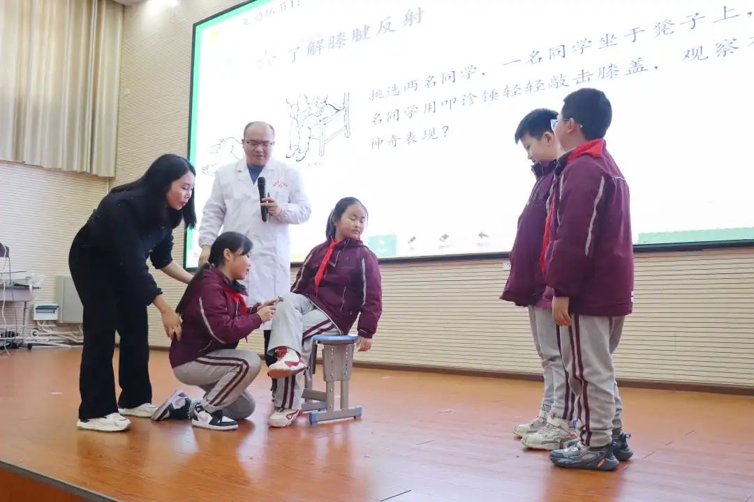 我們身體的每個部位都有其存在的意義,蔣醫(yī)生邀請了兩組同學(xué)上臺進(jìn)行膝腱反射實驗,一名同學(xué)坐于凳子上,另一名同學(xué)用叩診錘輕輕敲擊膝蓋,觀察有什么神奇表現(xiàn)。 試驗后,孩子們感嘆道,原來自己身體的每一個部位都如此重要,它們相互牽連,相互作用,時刻帶動著自己的身體運動著。