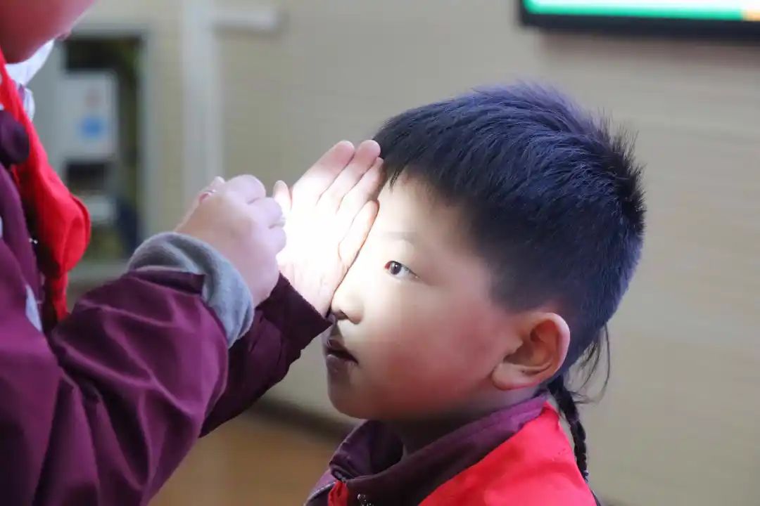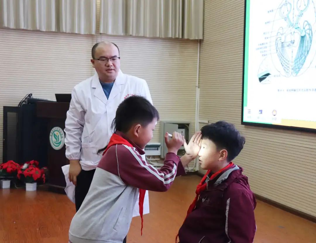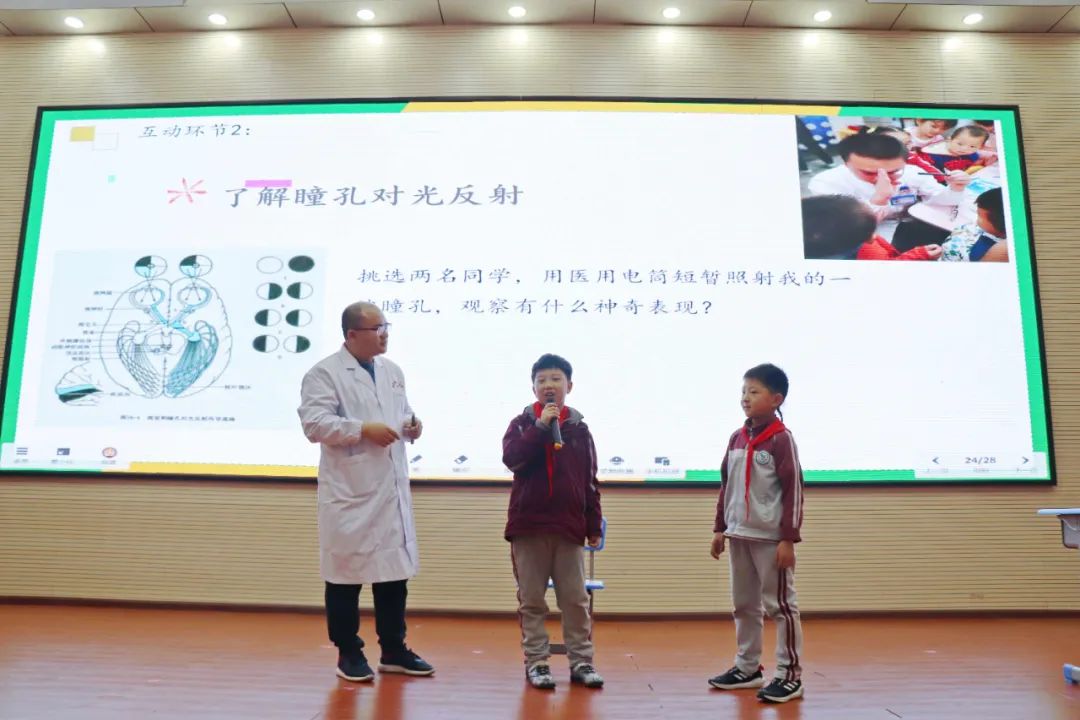 你知道嗎?健康的人眼受到光線刺激后瞳孔會立即縮小,移開光源后瞳孔迅速復(fù)原。若瞳孔對光反射異常,可能是昏迷顱腦外傷,腦出血,腦腫瘤等因素產(chǎn)生。 帶著對于眼睛的好奇心,孩子們積極舉手互動上臺進(jìn)行瞳孔對光反射實驗,在蔣醫(yī)生專業(yè)指導(dǎo)下,一名同學(xué)用醫(yī)用電筒短暫照射另一名同學(xué)的一邊瞳孔并觀察。 觀察后兩名同學(xué)分別描述出自己看到的瞳孔變化,感受到了實驗的神奇,自己的眼睛原來如此敏感脆弱,我們更要愛護(hù)自己的眼睛,保護(hù)雙眼不受傷害。