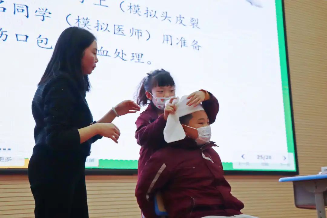 繃帶包扎是外傷現(xiàn)場應(yīng)急處理的重要措施之一。及時正確的包扎,可以達(dá)到壓迫止血、減少感染、保護(hù)傷口、減少疼痛等目的。 蔣醫(yī)生在桌子上準(zhǔn)備了幾樣止血包扎的醫(yī)療用品,模擬受傷場景,學(xué)生自行挑選一件進(jìn)行操作,教師指導(dǎo)。隨后蔣醫(yī)生進(jìn)行完整的止血包扎正確流程并提示注意事項。