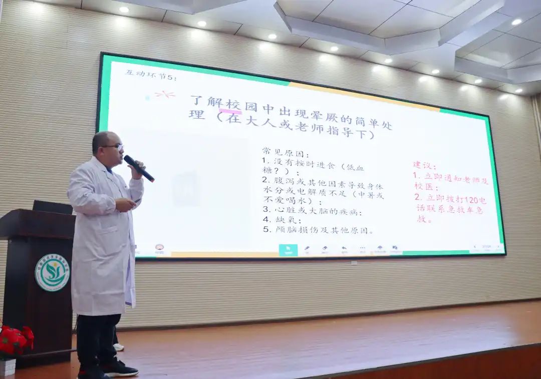 天氣日漸炎熱,校園中不時會出現(xiàn)同學(xué)暈厥的情況,蔣醫(yī)生通過提問的方式讓孩子們闡述出現(xiàn)暈厥的原因。 孩子們回答后,蔣醫(yī)生專業(yè)的解釋到出現(xiàn)暈厥的常見原因:1.沒有按時進(jìn)食(低血糖)2.腹瀉或其他因素導(dǎo)致身體水分或電解質(zhì)不足(中暑或不愛喝水)3.心臟或大腦的疾病4.缺氧5.盧顱腦損傷及其他原因。 如果出現(xiàn)身邊的人發(fā)生暈厥情況你會怎么辦呢?蔣醫(yī)生建議:1.立即通知老師及校醫(yī)2.立即撥打120電話聯(lián)系急救車急救。