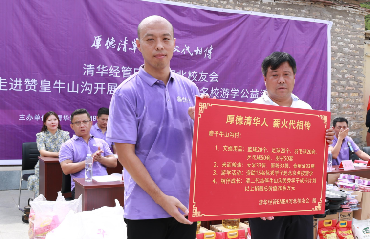 隨后,河北校友會向牛山溝村捐贈了此次公益活動的相關(guān)物資,包括文娛用品、米面糧油、資助牛山溝優(yōu)秀學(xué)子赴北京名校游學(xué)名額、開展清華經(jīng)管EMBA河北校友會攜“清二代”結(jié)伴鄉(xiāng)村優(yōu)秀學(xué)子成長計劃,捐贈總價值20余萬元,以期對牛山溝村的教育事業(yè)貢獻一份力量。牛山溝村黨支部書記兼村委會主任崔天民代表牛山溝村對河北校友會的捐贈表達了感謝。