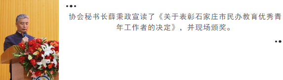 河北省教育廳原副廳長(zhǎng)、河北省創(chuàng)新教育學(xué)會(huì)會(huì)長(zhǎng)韓清林 河北省創(chuàng)新教育學(xué)會(huì)秘書長(zhǎng)趙志同 市教育局原副局長(zhǎng)、省政府督學(xué)、市民辦教育協(xié)會(huì)會(huì)長(zhǎng)李冀生 協(xié)會(huì)秘書長(zhǎng)薛秉政 協(xié)會(huì)各副會(huì)長(zhǎng)、工作部主任、副主任,河北陽(yáng)光教育集團(tuán)董事長(zhǎng)李圣勇 聯(lián)合創(chuàng)始人劉好寬 副總閆振利及接受表彰的各民辦教育單位的優(yōu)秀青年等 共計(jì)300余人參加了會(huì)議 協(xié)會(huì)常務(wù)副會(huì)長(zhǎng)、石家莊第二外國(guó)語學(xué)校校長(zhǎng)任克茵主持會(huì)議