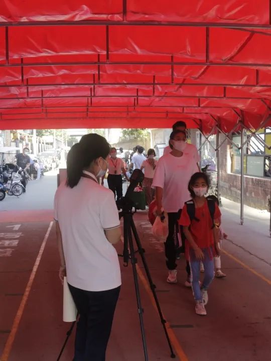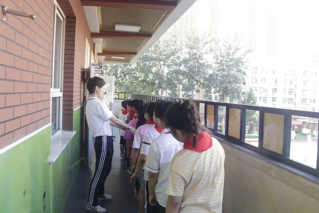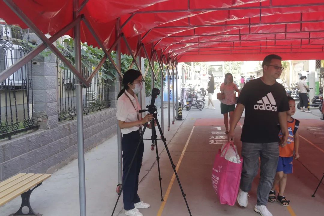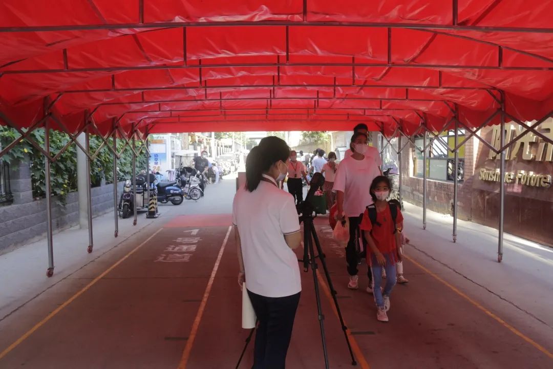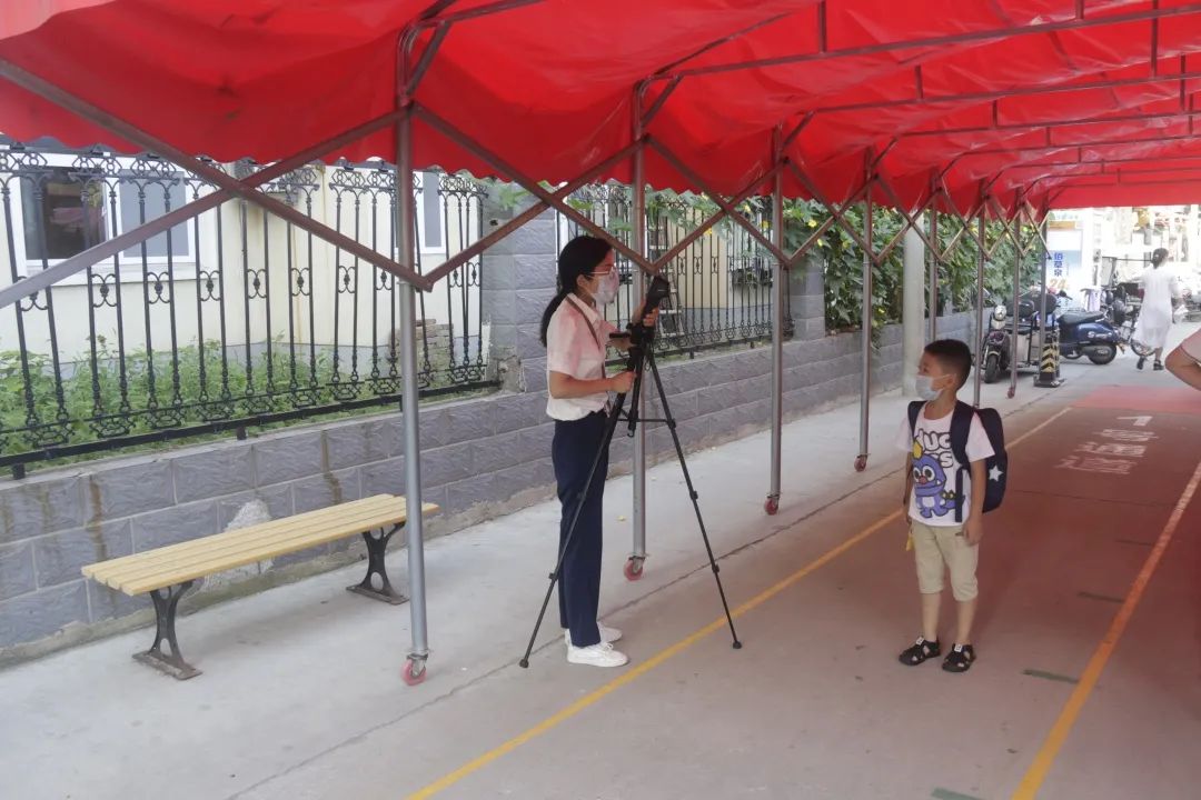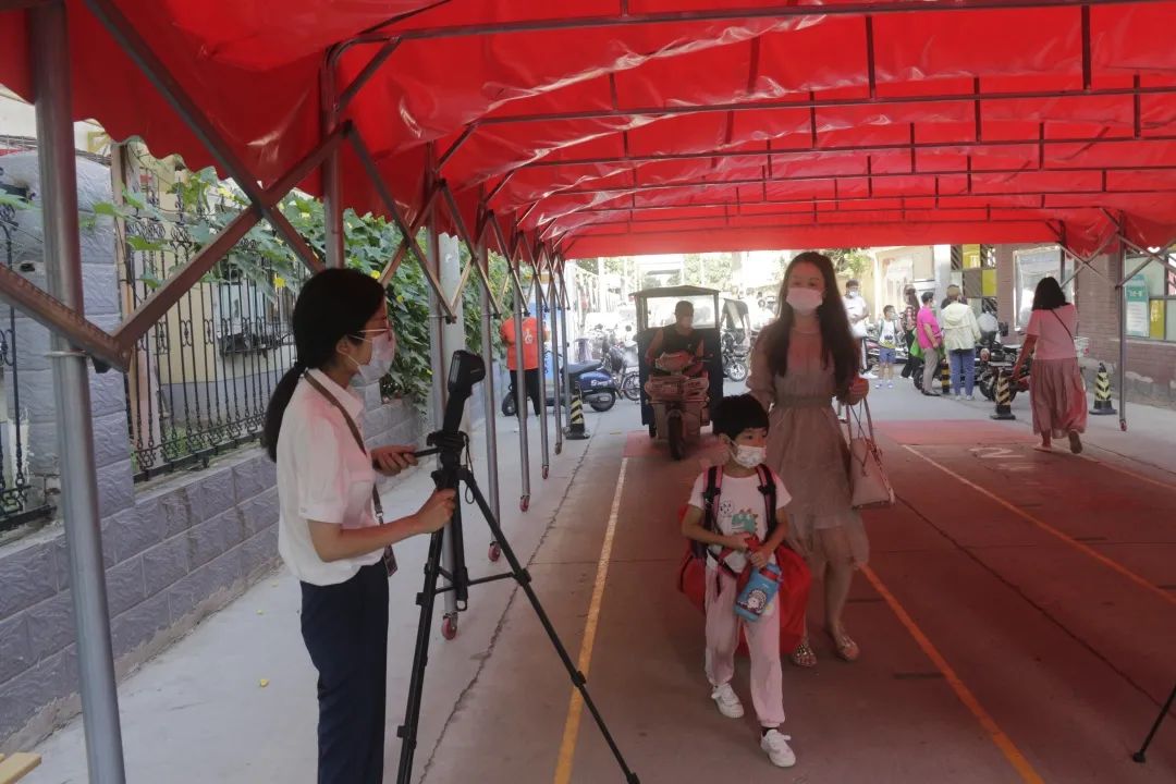 學(xué)校按照防疫要求,校門外設(shè)立測溫點(diǎn)、臨時觀察點(diǎn)、資料收取處。學(xué)生間隔一米距離,有序排隊,等候測量體溫,穿過重重“關(guān)卡”之后方可進(jìn)入校園。
