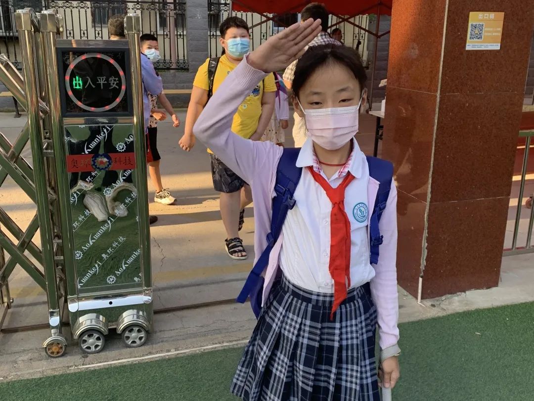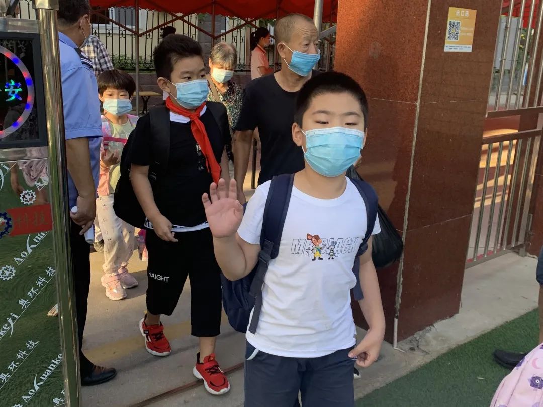 上午7點(diǎn)學(xué)生們佩戴口罩,通過測溫儀,有序入校