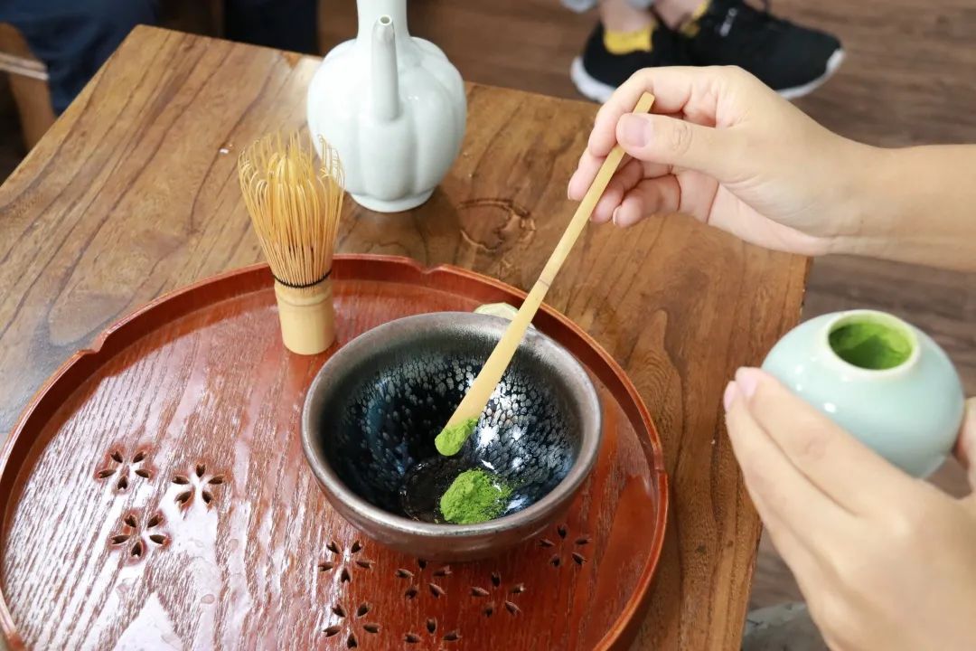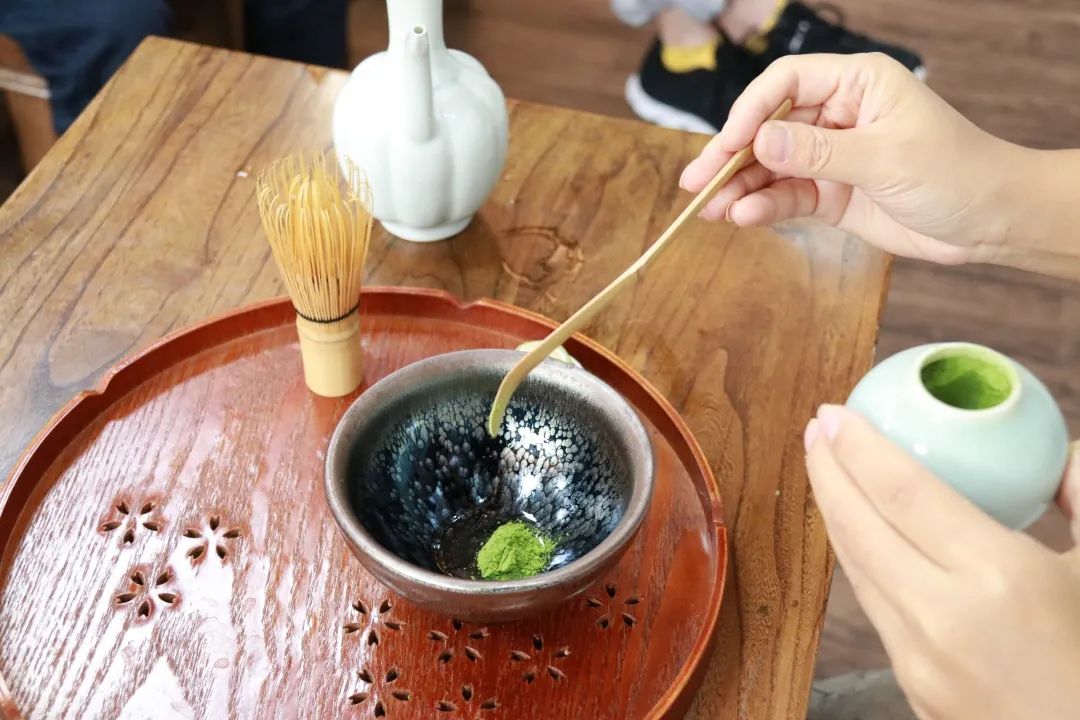 用茶勺將茶粉盛至建盞中。