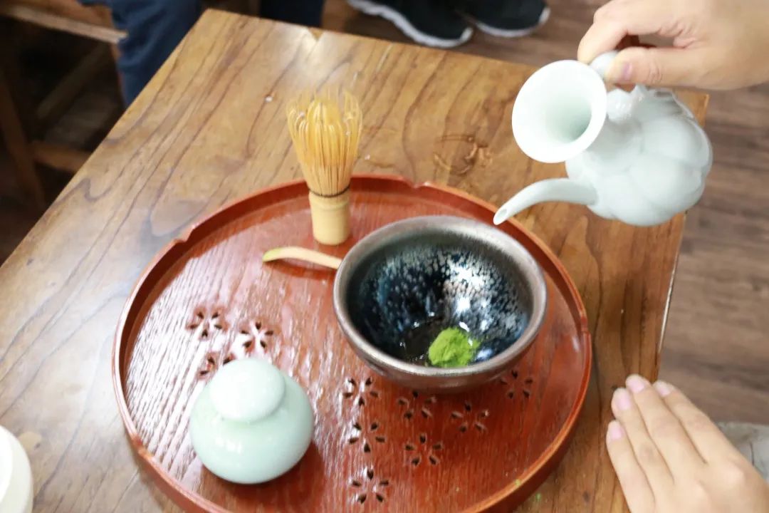 泡茶 熱水分兩次加入建盞中,用茶筅劃“1”字快速擊拂,使之產(chǎn)生沫浡咬盞。