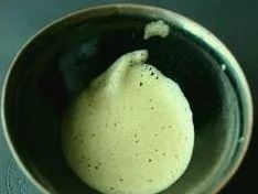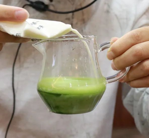 將牛奶加入咬盞的茶湯中,白色的牛奶與綠色的茶湯逐漸融合在一起,形成奶茶。糖也應(yīng)該加在這一步哦~