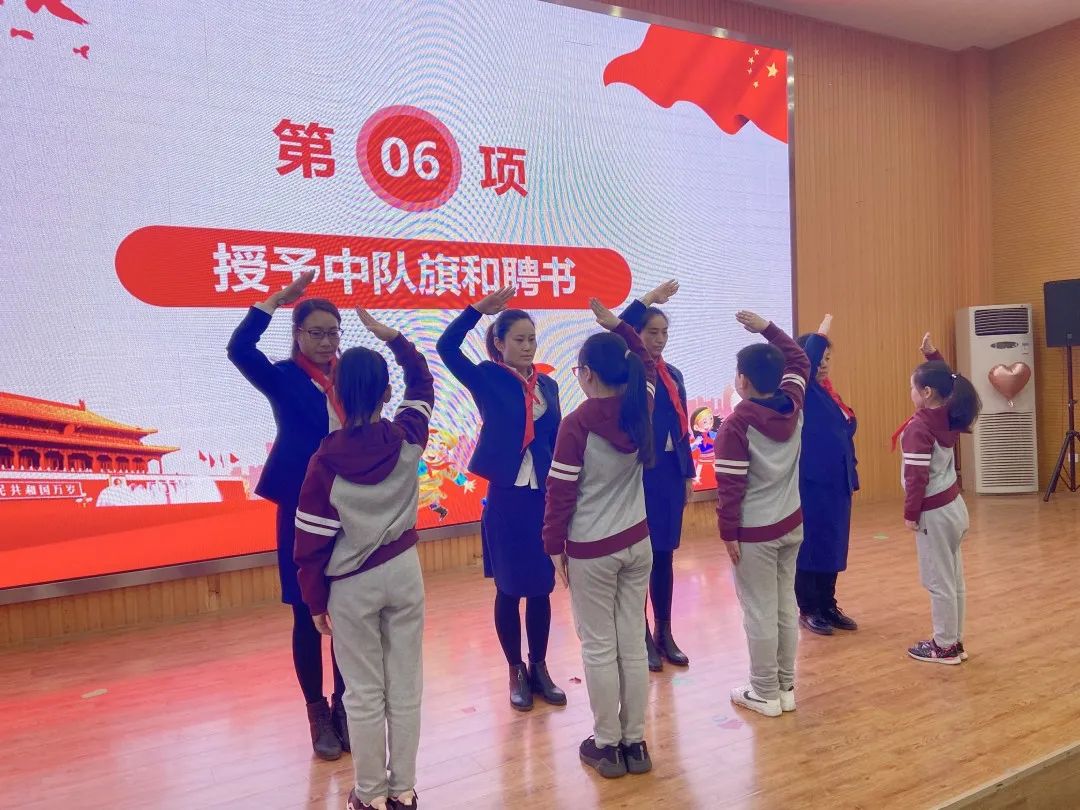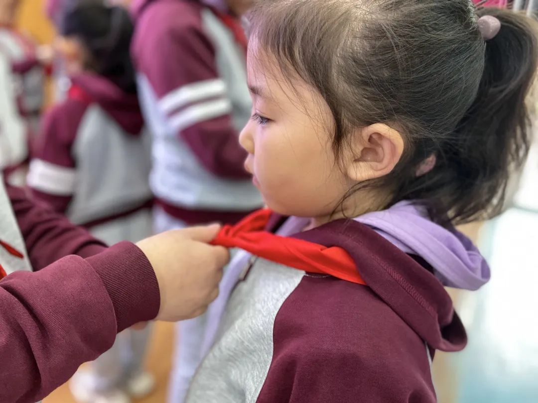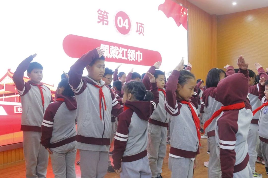接下來(lái),五年級(jí)的老隊(duì)員為新隊(duì)員佩戴紅領(lǐng)巾。在鮮艷紅領(lǐng)巾的襯托下,孩子們喜悅的心情溢于言表。