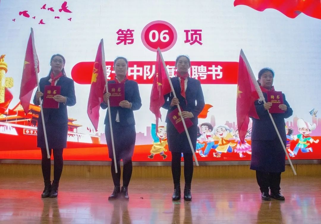 陽(yáng)光未來(lái)國(guó)際小學(xué)少先隊(duì)大隊(duì)委輔導(dǎo)員劉葉老師宣讀新建中隊(duì)輔導(dǎo)員名單。大隊(duì)部干部為新聘任輔導(dǎo)員老師獻(xiàn)紅領(lǐng)巾;隨后劉葉老師再為其授予中隊(duì)旗和聘書(shū)。