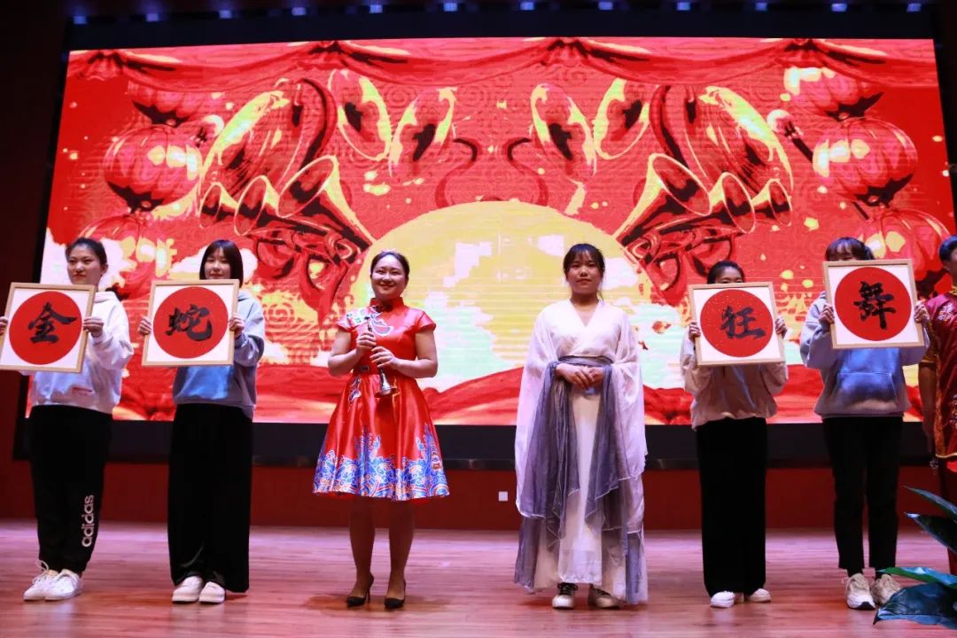 世紀(jì)圖新金蛇曼舞,神州大治玉宇澄清。爆竹響連天,金蛇騰云來,祥云彩虹舞連天。舞蹈、書法同臺表演《金蛇狂舞》。
