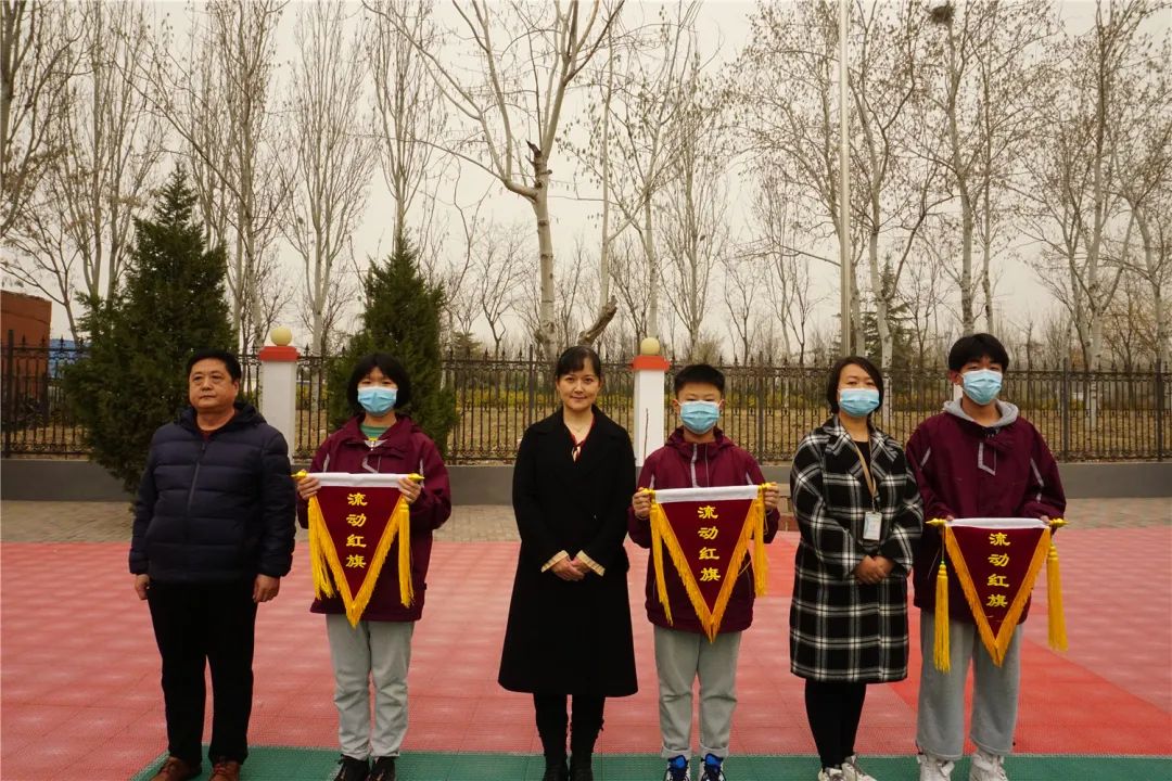 上周獲得流動紅旗的班級是七年級(3)班,八年級(5)班,九年級(4)班,各年級主任為他們頒獎。