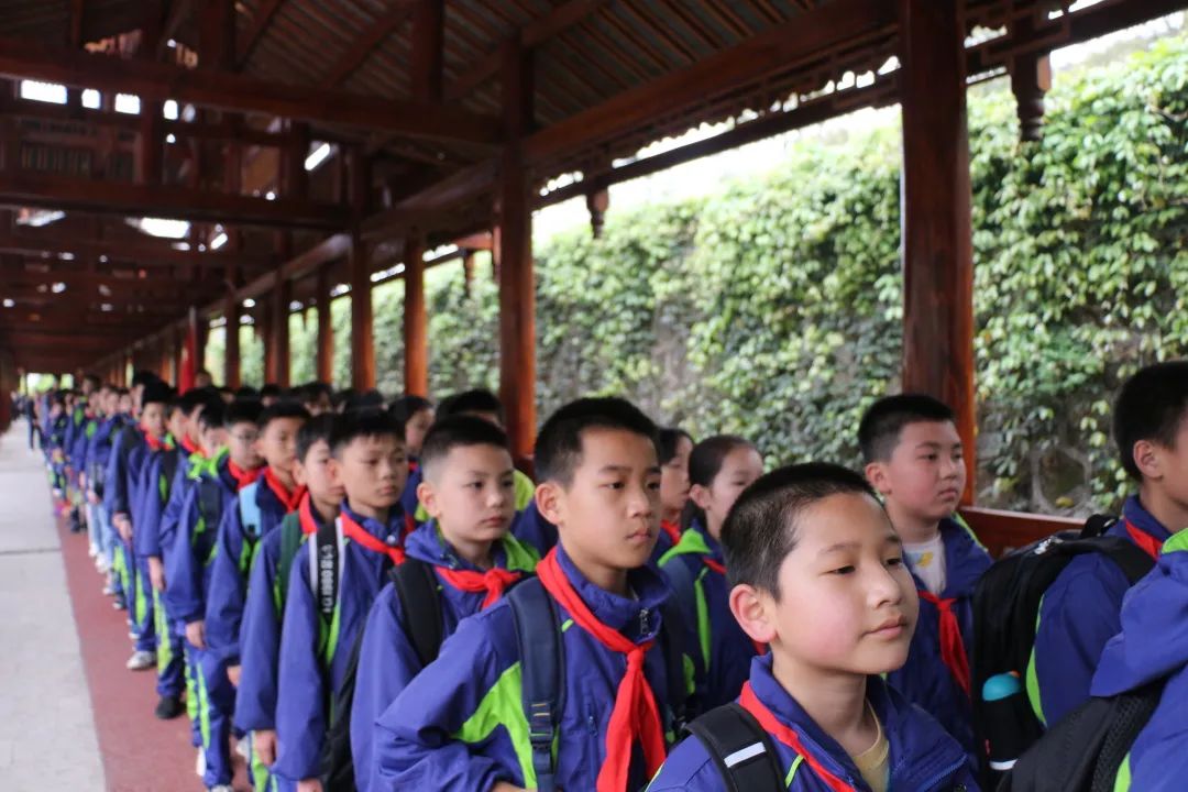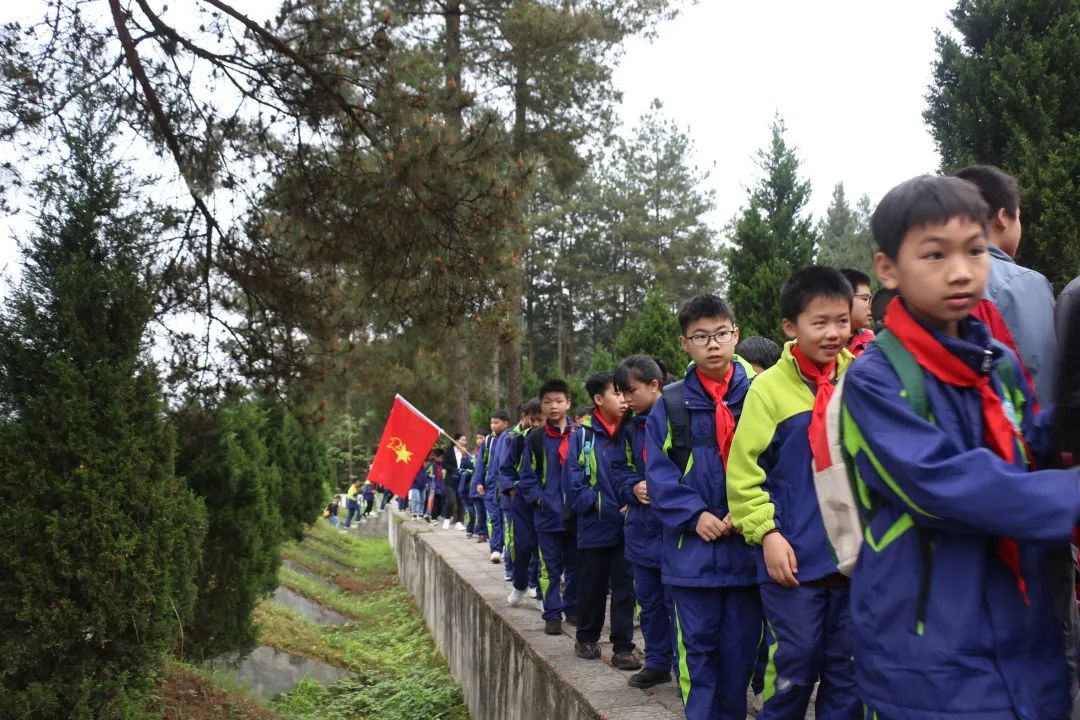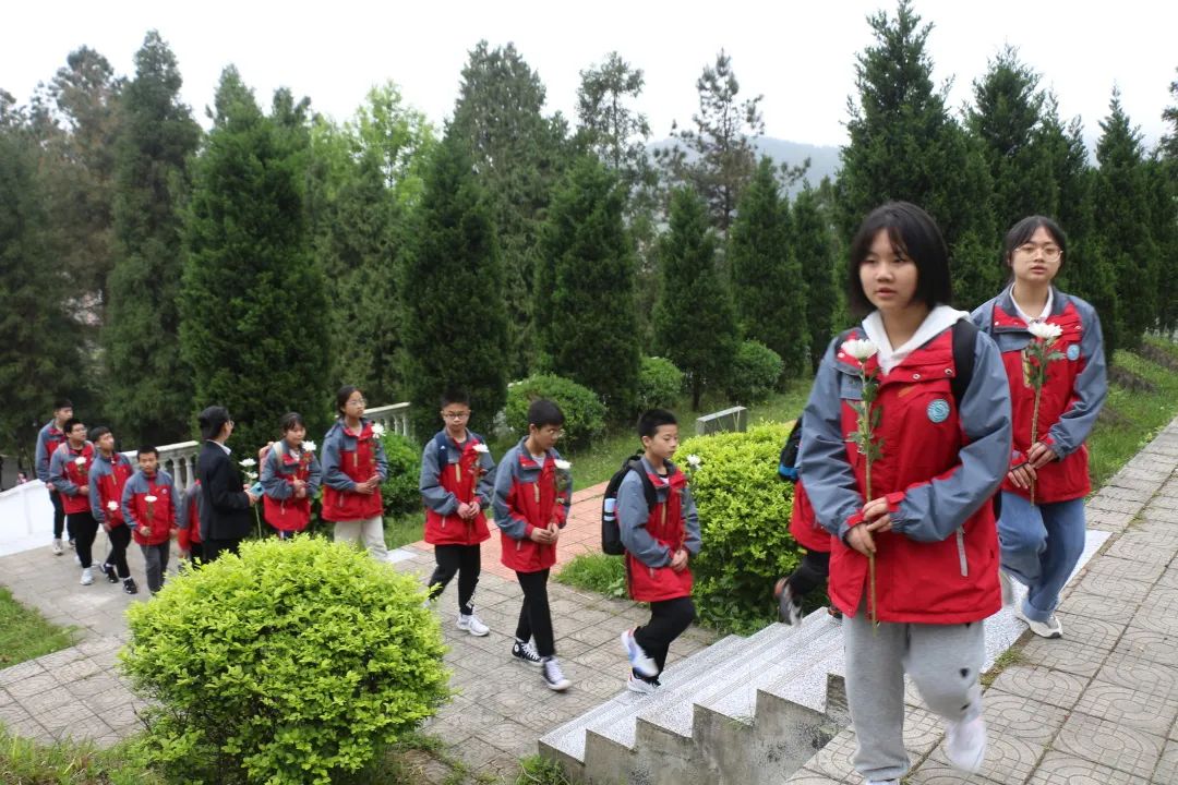早上7:20參加活動(dòng)的學(xué)校領(lǐng)導(dǎo)、小學(xué)部五年級(jí)和初中部七、八年級(jí)師生在操場(chǎng)集合,陽(yáng)光學(xué)子們穿著整潔的校服,懷著對(duì)烈士無(wú)限崇敬的心情有序地前往烈士陵園。