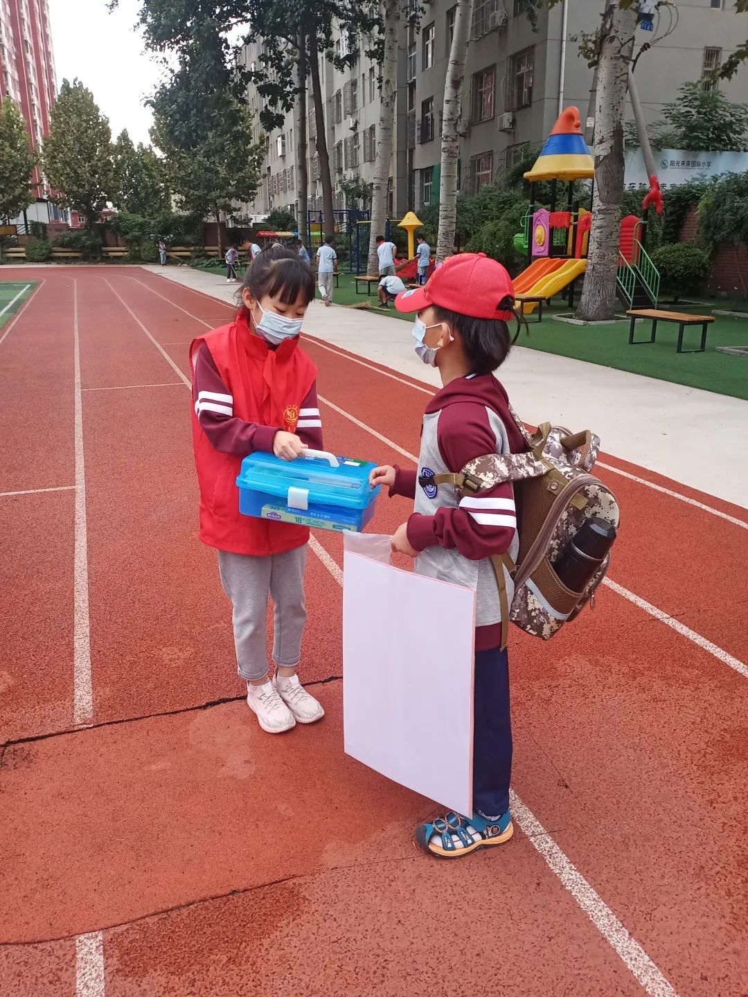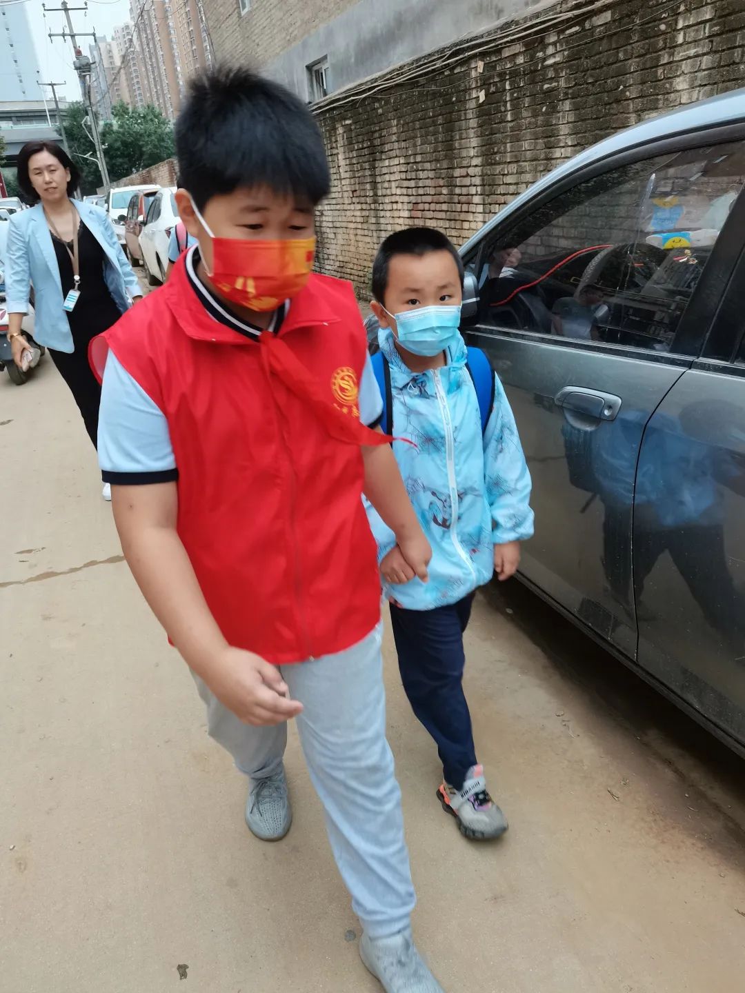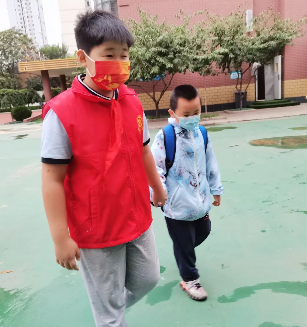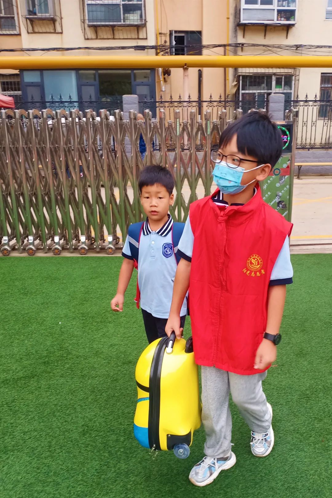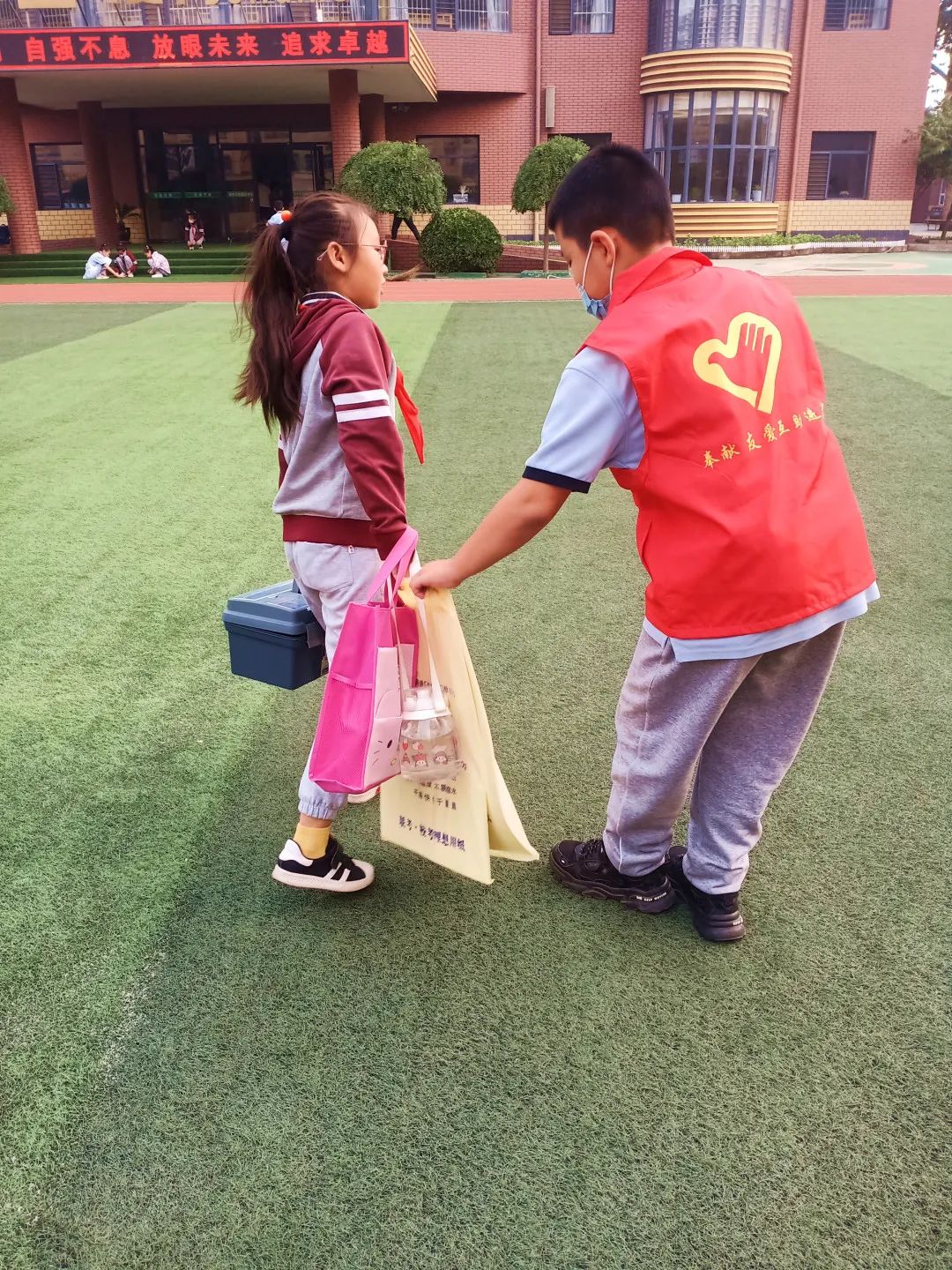 搬物品 低年級的同學(xué)因為帶的物品多,我們的小志愿者們紛紛伸出援手護(hù)送他們。