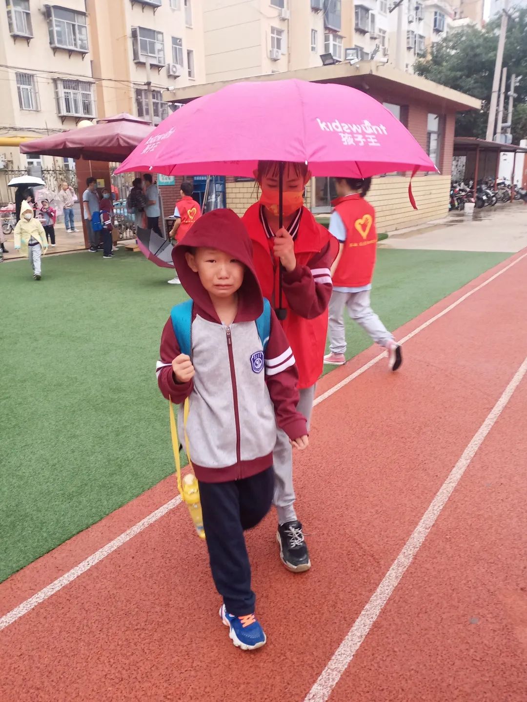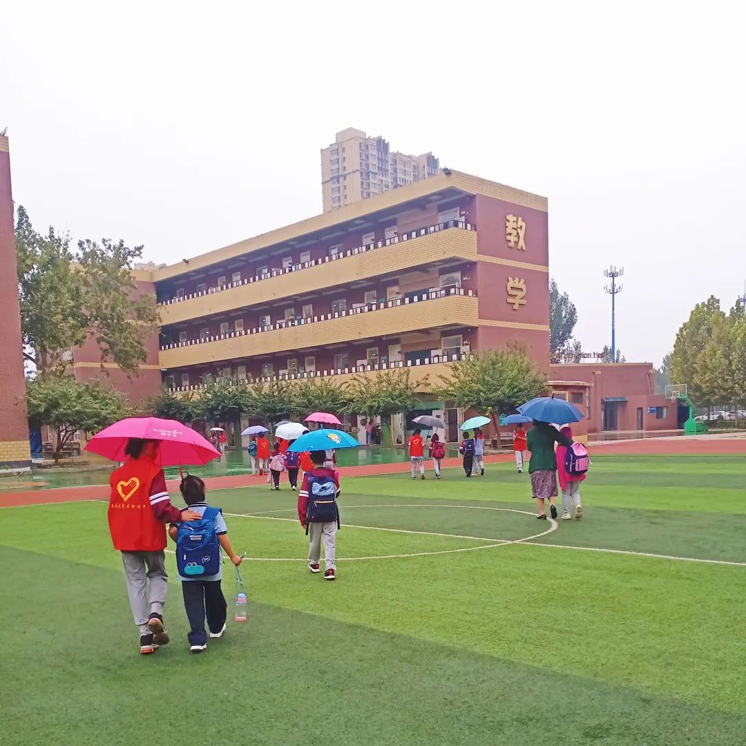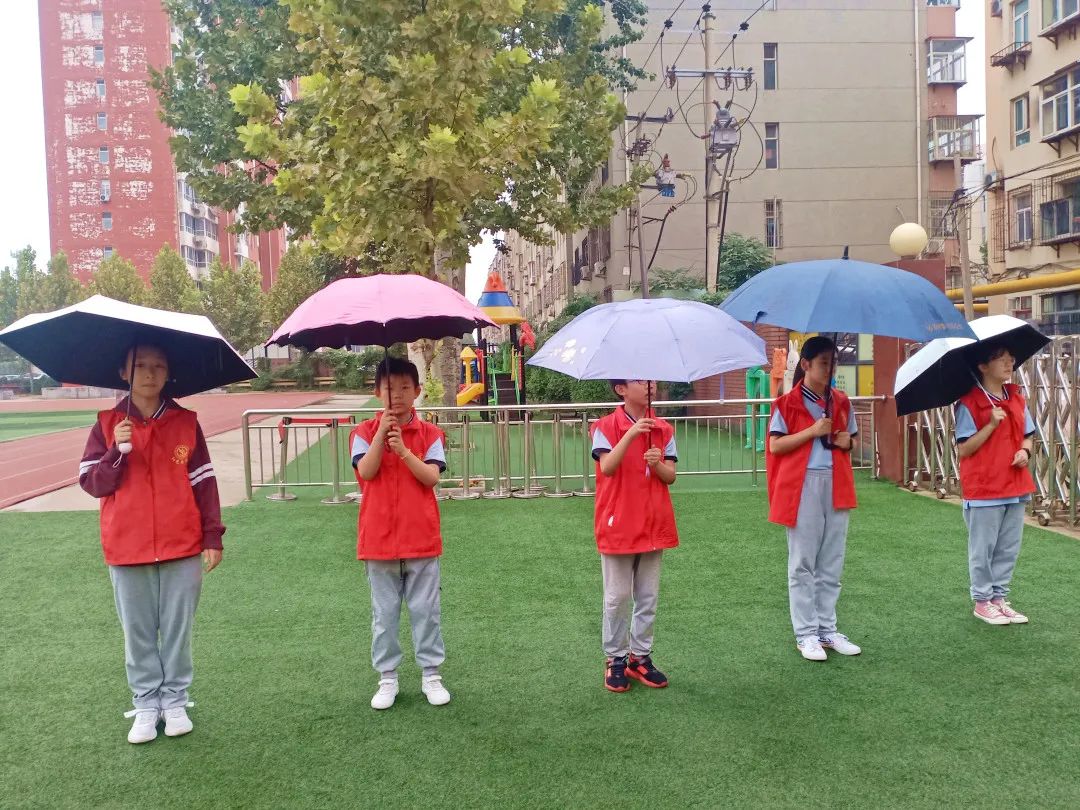 雨天送溫暖 9月14日清晨突然下起了小雨,小志愿者們在老師的協(xié)助下幫同學(xué)們撐起了一條遮風(fēng)擋雨的愛心長廊,他們用心迎接每一位進(jìn)校的同學(xué)。
