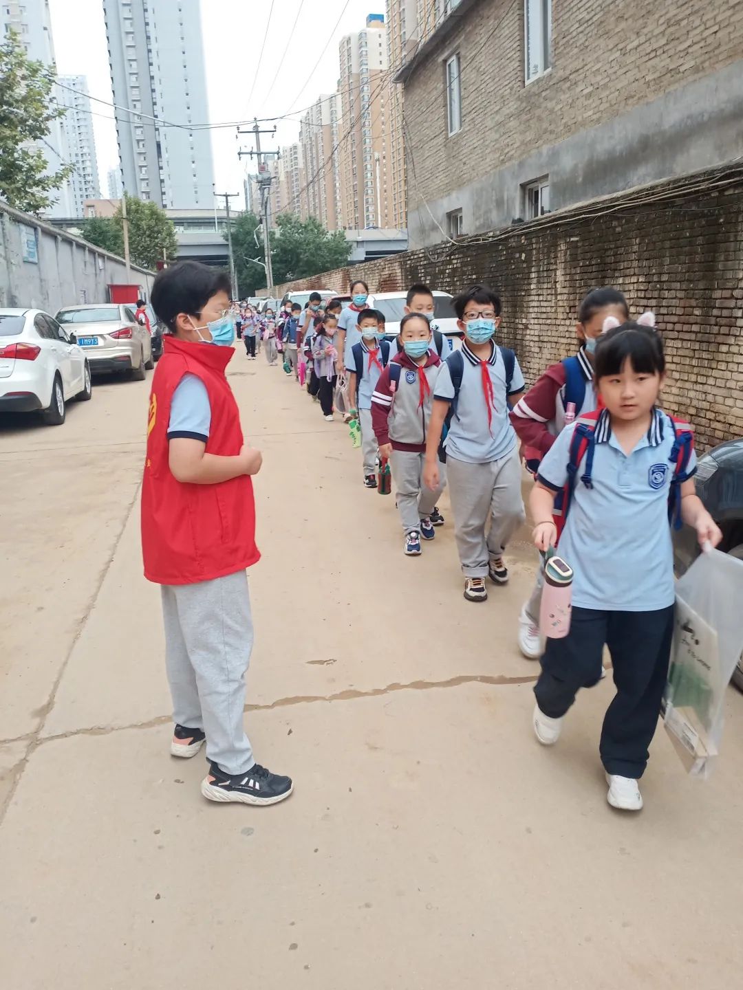 校門口 默默提醒同學(xué)們排隊靠邊行走,注意車輛,注意安全。