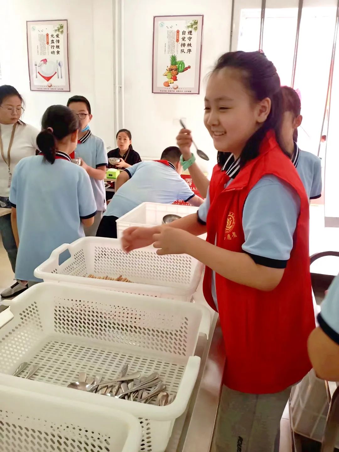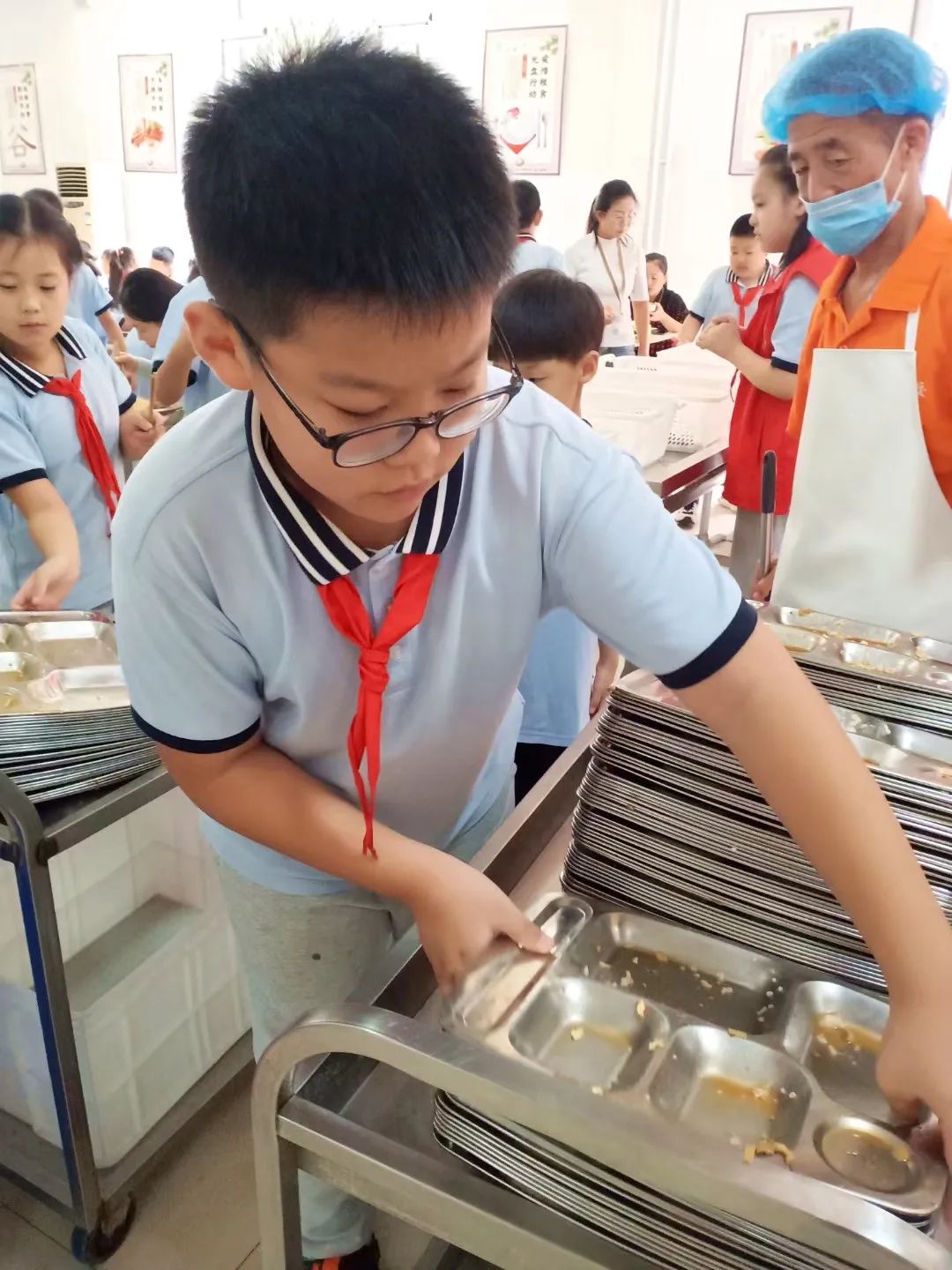 食堂 食堂里他們默默的幫助食堂的叔叔阿姨擺好就餐后的碗筷,提醒同學(xué)們減少浪費糧食。