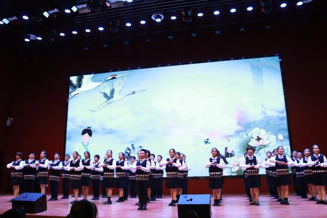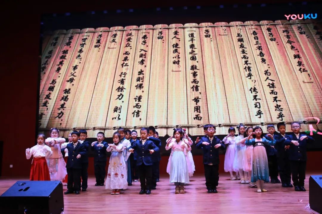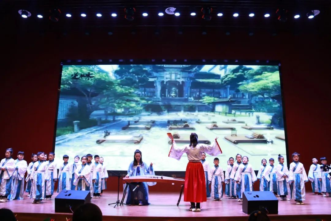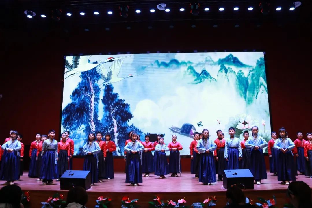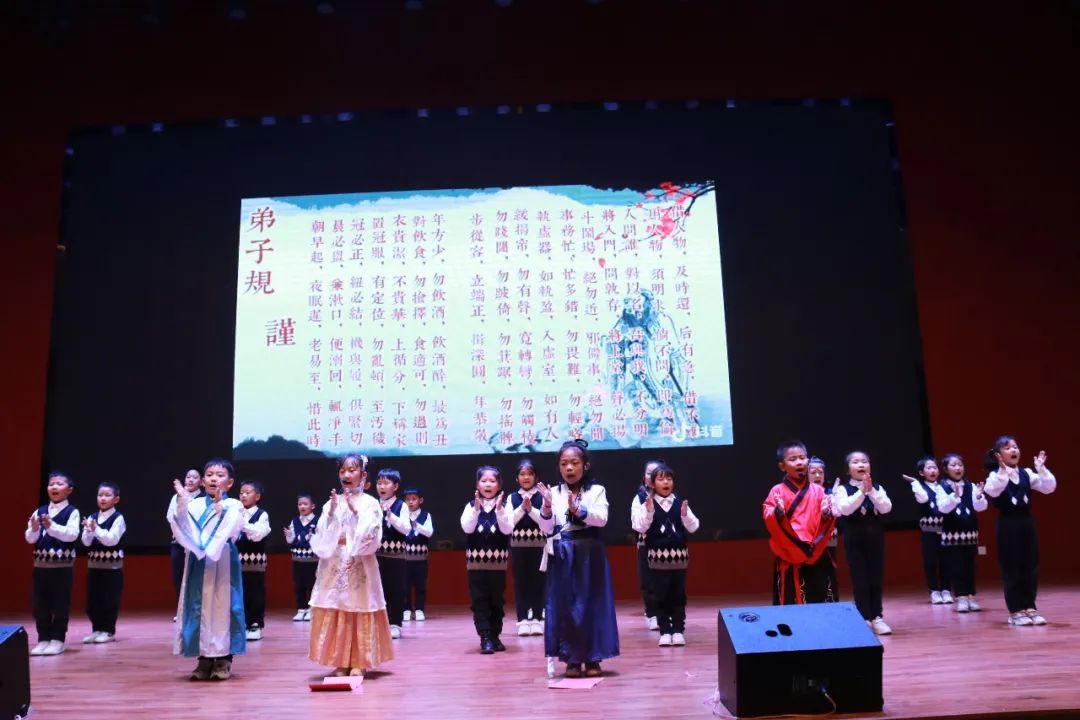 一年級(1)班 《弟子規(guī)》——信 古詩《詠鵝》 在上場時(shí)口號響亮整齊,他們的朗誦加入了自己的創(chuàng)作創(chuàng)新,老師和每位孩子都穿上了古色古香的漢服,仿佛穿越了時(shí)空。在古箏行云流水的旋律之間與朗朗誦讀聲結(jié)合在一起相得益彰!贏得場內(nèi)熱烈掌聲!