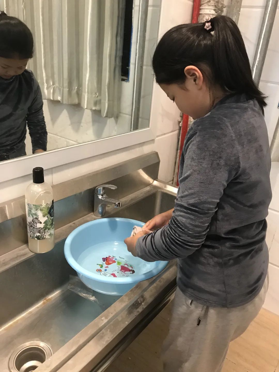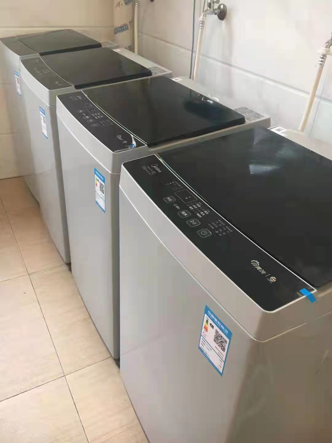 洗衣間 學(xué)校在每層宿舍樓安裝了四臺美的全自動洗衣機供學(xué)生免費使用,平時上課前把臟衣物放進(jìn)洗衣機后生活老師會幫助學(xué)生晾曬,并對洗衣機堅持用一次消毒一次。