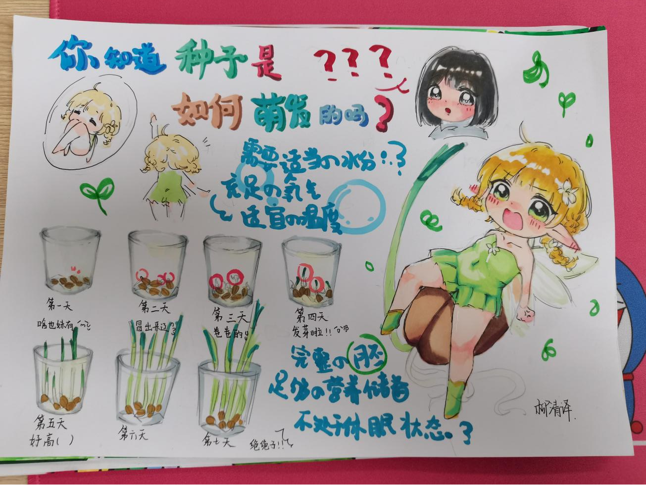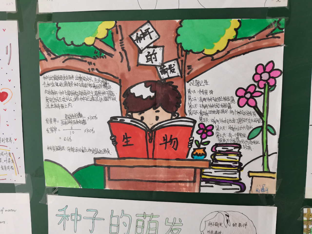 興趣是求知的開始,是學習的動力,只有當孩子對所研究的活動產生濃厚的興趣時,他們才會積極地探索、仔細地觀察、認真地思考。 知識小課堂 在種子萌發(fā)的過程中,胚根發(fā)育成植物體的根,胚芽發(fā)育成莖和葉兒,所以。胚是種子的主要部分,是新植物的幼體。 種子的萌發(fā)是綠色開花植物生命周期的開始。種子中不僅包含著一個新植物的幼體,而且能為種子的萌發(fā)提供營養(yǎng)物質。在條件適宜的情況下,種子就會萌發(fā),開始植物的生活。 孩子們以手抄報的形式,圖文并茂地將自己的觀察過程記錄了下來。 【種子的萌發(fā)作品展】