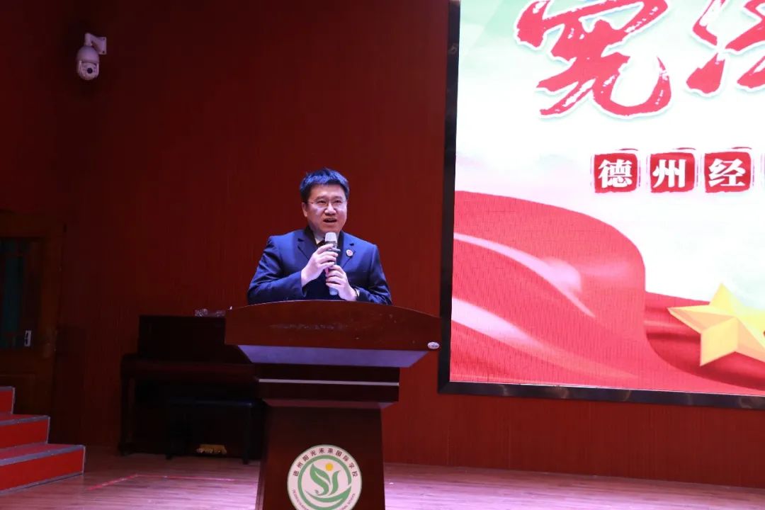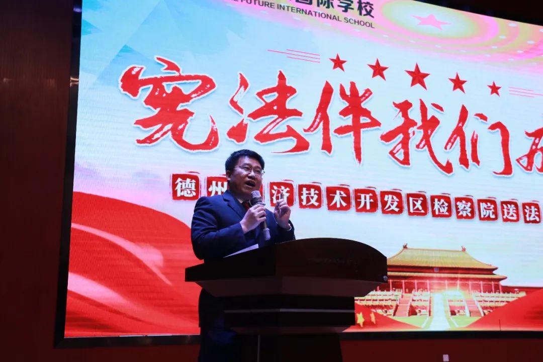 參加大會的領(lǐng)導有: 檢察院黨組副書記副檢察長李金玉女士,第一檢察部主任李林麟先生,今天的主講人第一檢察部員額檢察官李波先生,德州陽光未來國際學校安學新校長。