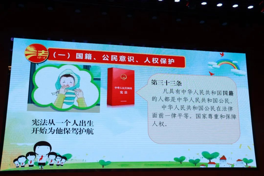 在國籍、公民意識、人權(quán)保護中。以《小紅的出生》舉例來說明憲法第三十三條規(guī)定凡具有中華人民共和國國籍的人都是中華人民共和國公民。中華人民共和國公民在法律面前一律平等。國家尊重和保障人權(quán)。憲法是從一個人的出生就為他保駕護航的。