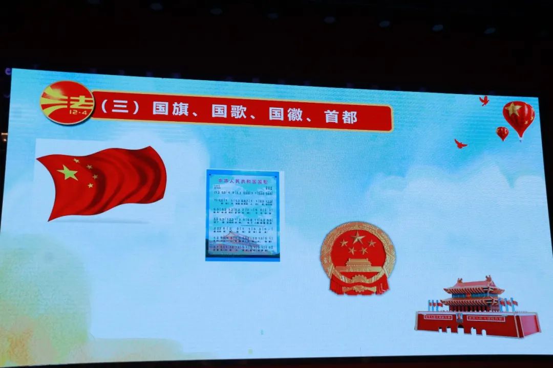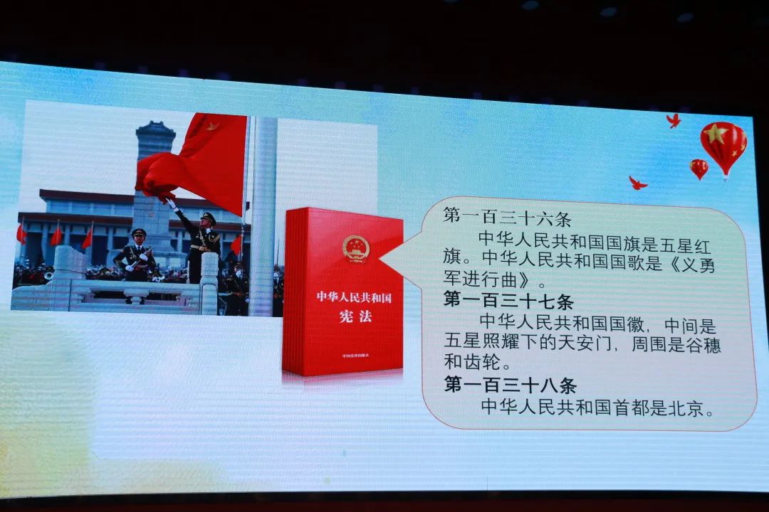 在維護國家安全、榮譽和利益的義務(wù)中又以《小紅的理想》、通過圖片等舉例來告訴同學們,有國才有家,我們的祖國永遠與我們同呼吸、共命運!國家,為我們謀幸福。同時,國家需要我們的愛! 在憲法第五十二條中寫到:中華人民共和國公民有維護國家統(tǒng)一和全國各民族團結(jié)的義務(wù)。 第五十四條 中華人民共和國公民有維護祖國的安全、榮譽和利益的義務(wù),不得有危害祖國的安全、榮譽和利益的行為。 保衛(wèi)祖國、抵抗侵略是憲法賦予我們的神圣職責。 習近平總書記也提出,我們要有“修身、齊家、治國、平天下”的家國情懷。愛國,是我們的義務(wù)! 李檢察官通過以上幾個方面展開,讓同學們了解公民需要了解的基本權(quán)利和義務(wù)。
