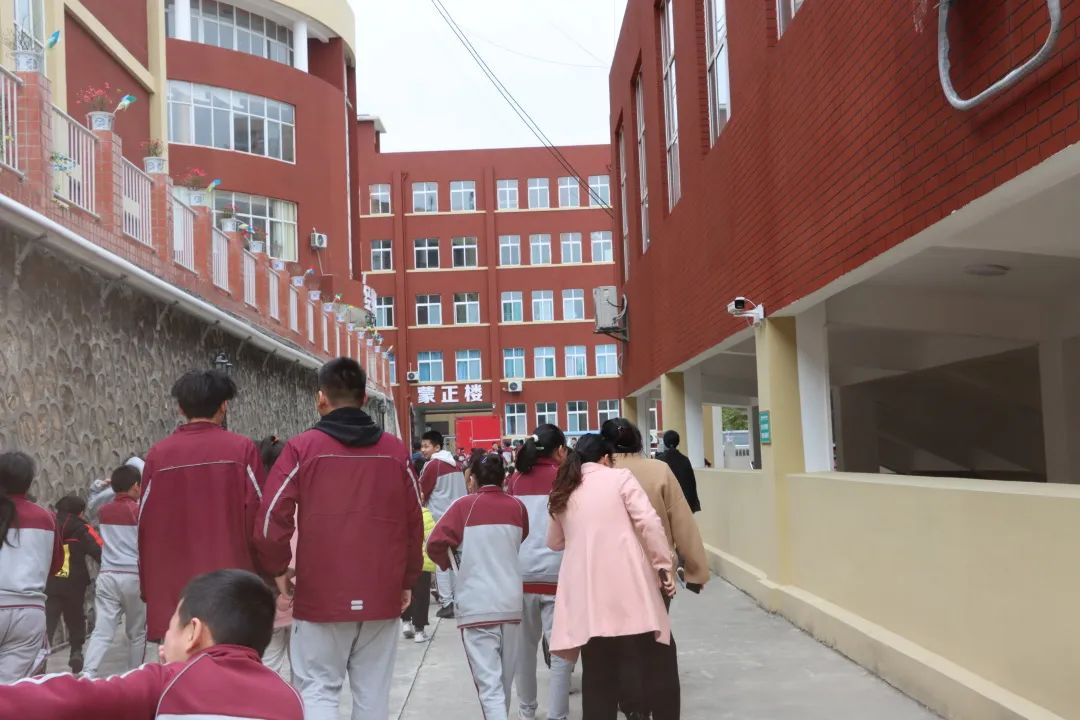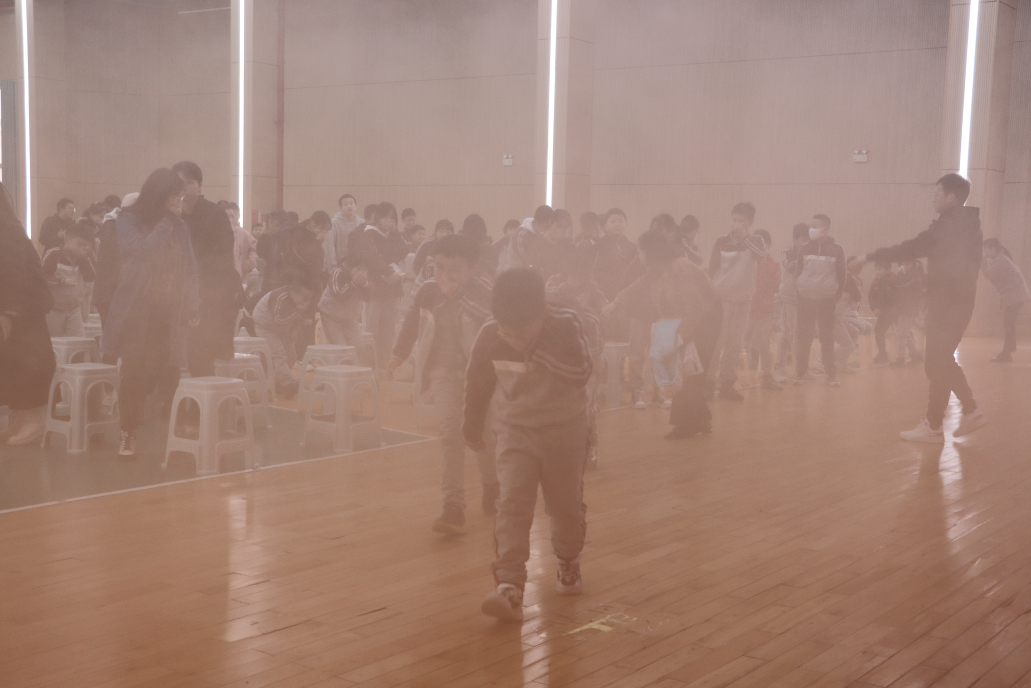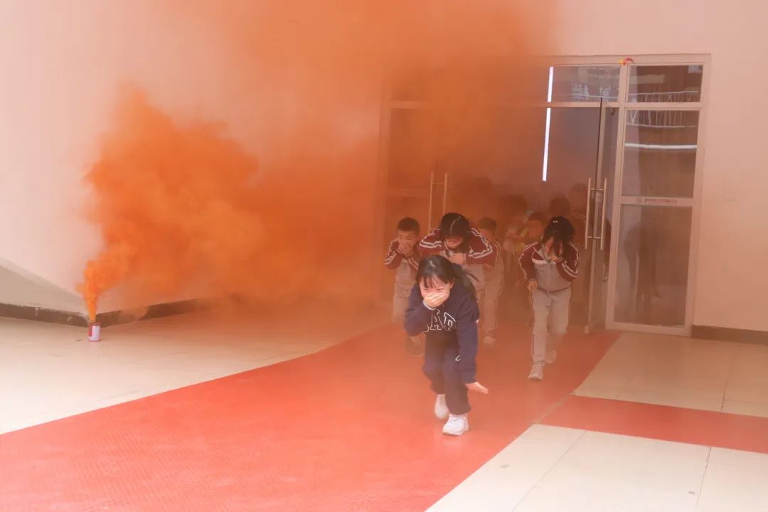 講座結(jié)束后,全校師生立即進(jìn)行了一次火災(zāi)疏散逃生演練。隨著一陣迷霧濃煙的出現(xiàn)和警報(bào)聲的響起,同學(xué)們在老師的指揮下用手捂住口鼻,彎腰低姿沿著安全出口標(biāo)識迅速撤離,有序到達(dá)安全地帶。