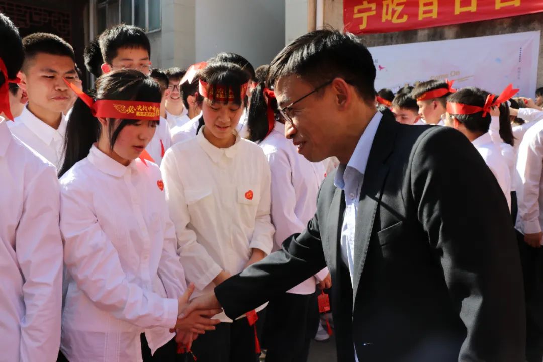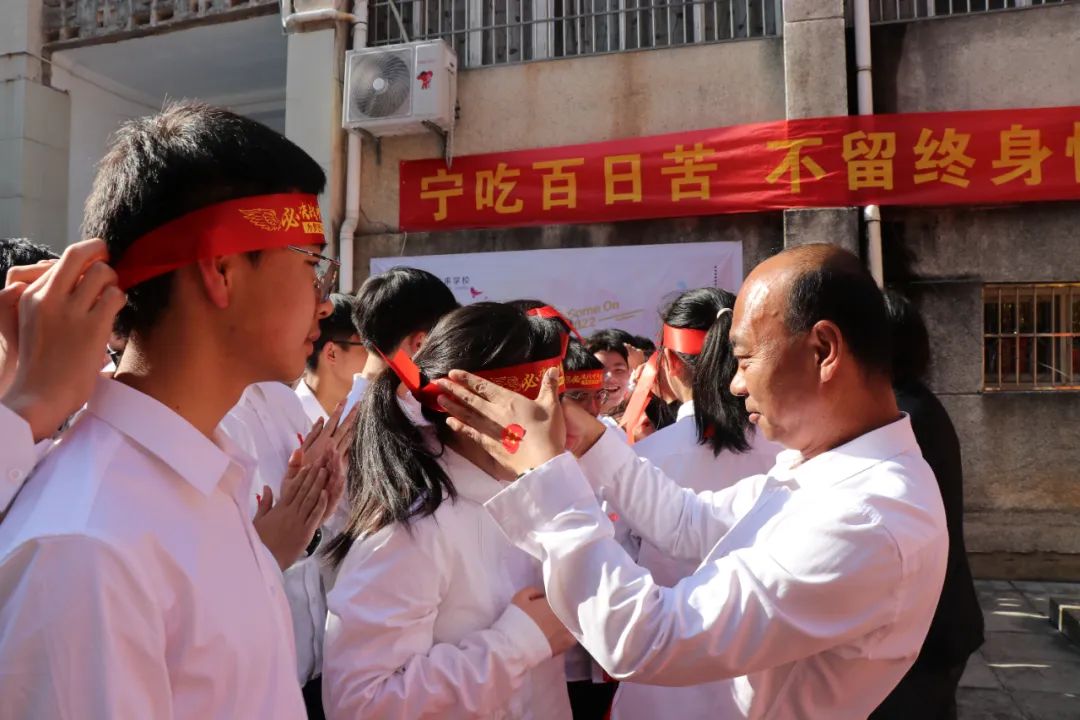 段海春校長(zhǎng)、劉昌龍副校長(zhǎng)及9年級(jí)任課老師們一一為學(xué)子們綁上寫有“必勝”的頭巾,送上自己最真摯的祝福。