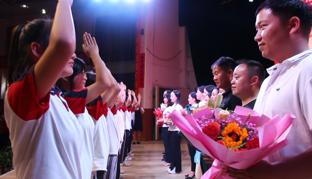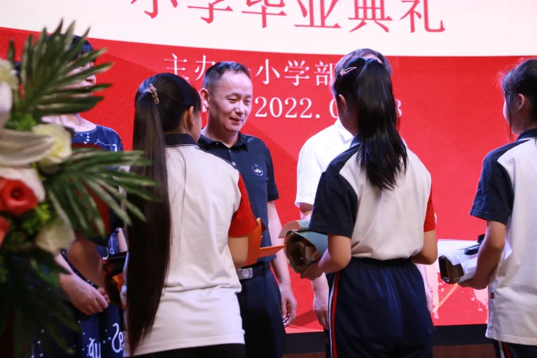 畢業(yè)生代表手捧鮮花為所有畢業(yè)班老師獻(xiàn)上了祝福,感恩老師們六年的陪伴和關(guān)懷