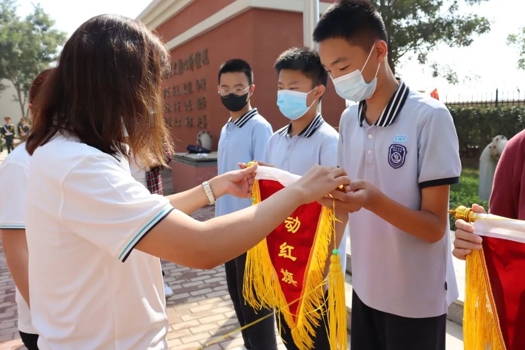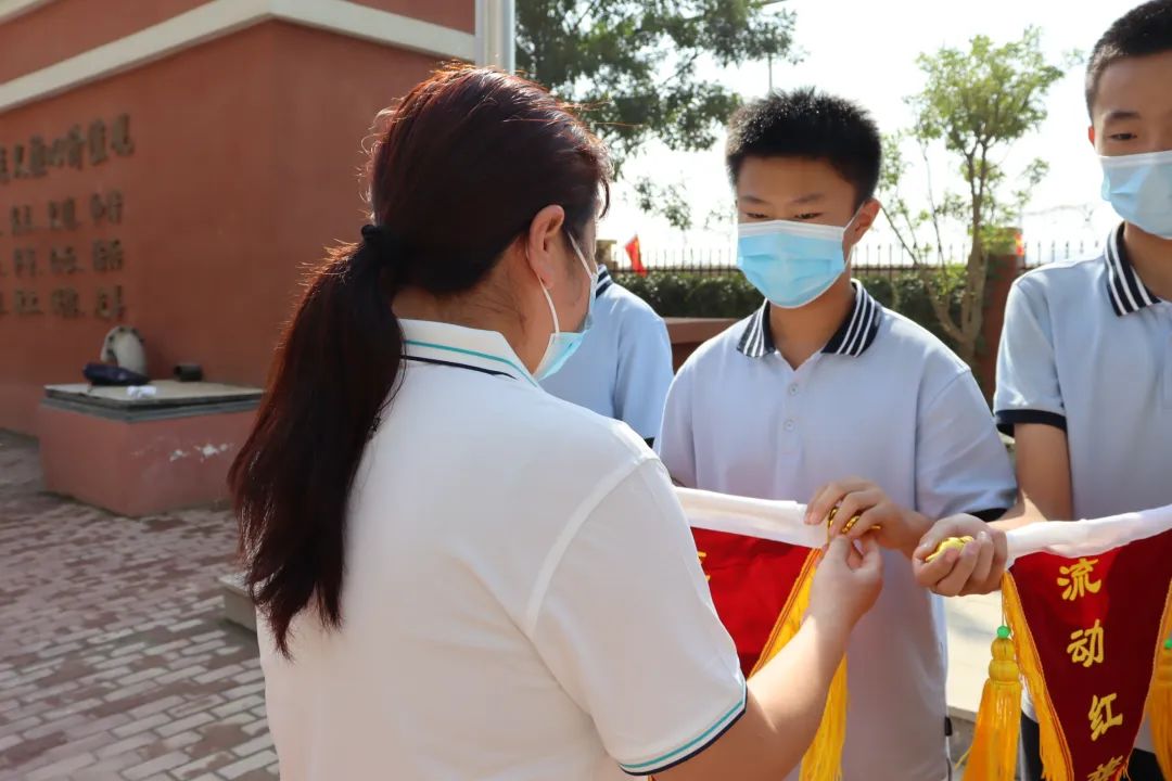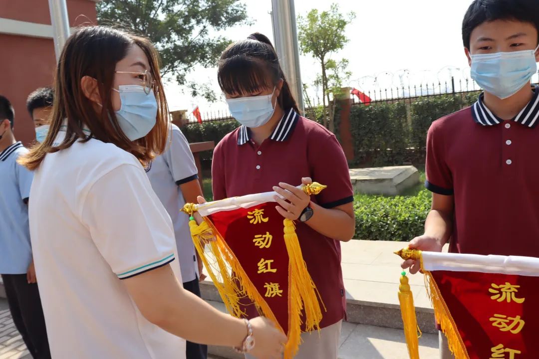 趙春英老師帶領(lǐng)全體教師宣誓 師者宣言: 師者,當(dāng)敬畏、尊重、仰望每一個生命; 用生命傳遞生命; 用靈魂喚醒靈魂; 用人格塑造人格。 師者,當(dāng)基于每一個生命, 發(fā)展每一個生命, 成就每一個生命, 讓每一個生命靈動飛揚(yáng)! 06頒發(fā)流動紅旗