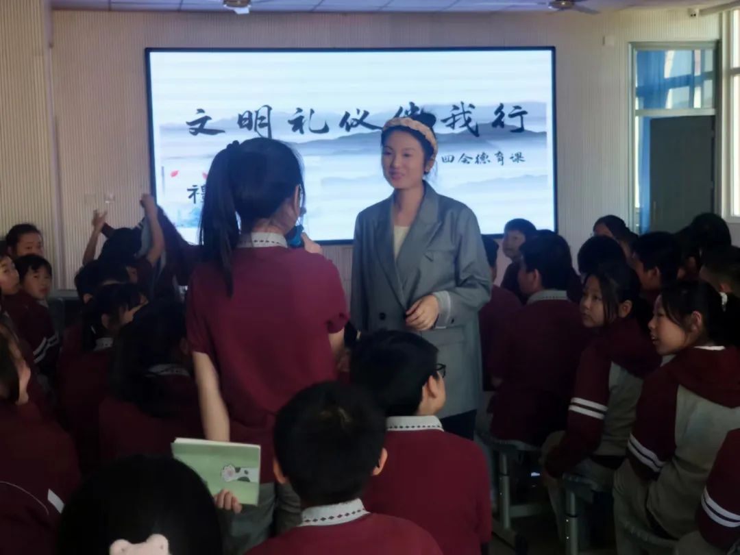活動上同學們與老師互動交流 在一問一答的形式中 把文明禮儀教育融入到日常教學之中 引導同學們爭做一個 懂禮儀規(guī)范、講文明言語 守公共秩序的好孩子 讓學生爭做“文明禮儀小標兵”